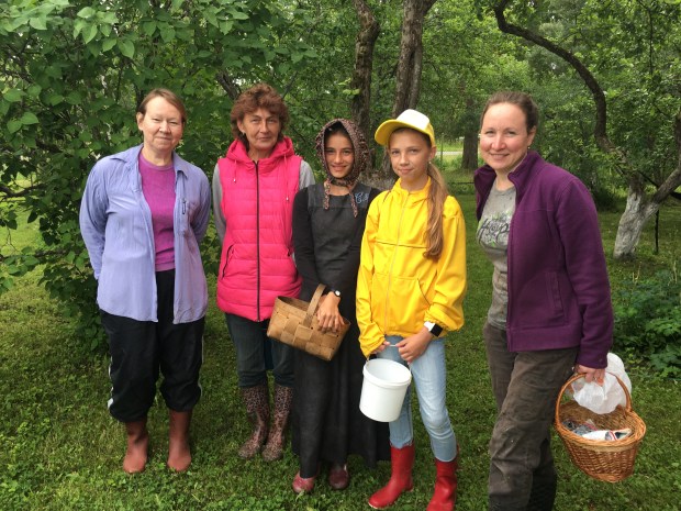 It is berry-picking time in Russia. Above Olga and Val are joined by Olga’s mom (at left), Val’s friend Yanna and Yanna’s mom as they head out to the forest for blueberries. Val found a costume bonnet we had and thought it the best head-wear for the day.