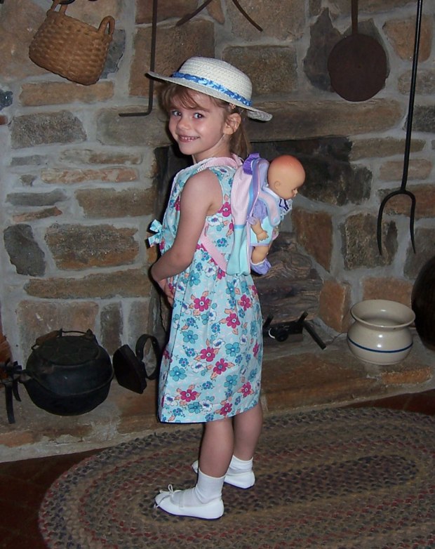 For now — here’s a picture of Valerie with her new hat and ‘baby backpack’; both were gifts from friends. Valerie is having a great visit. And she’s already speaking some English!